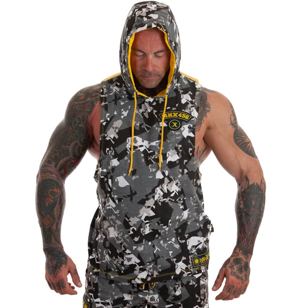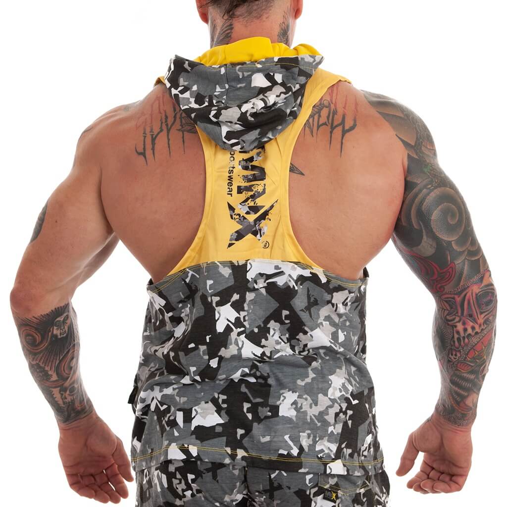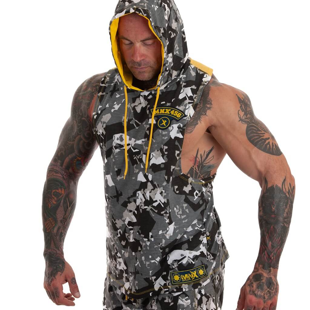 Camo Hooded tank top helps you move with ease thanks to soft and breathable fabric. Made of 100% pure cotton. Unique MNX inspired camo pattern and patches. On back added yellow mesh fabric detail with sublimational print. It’s perfect for your workout and casual wear.