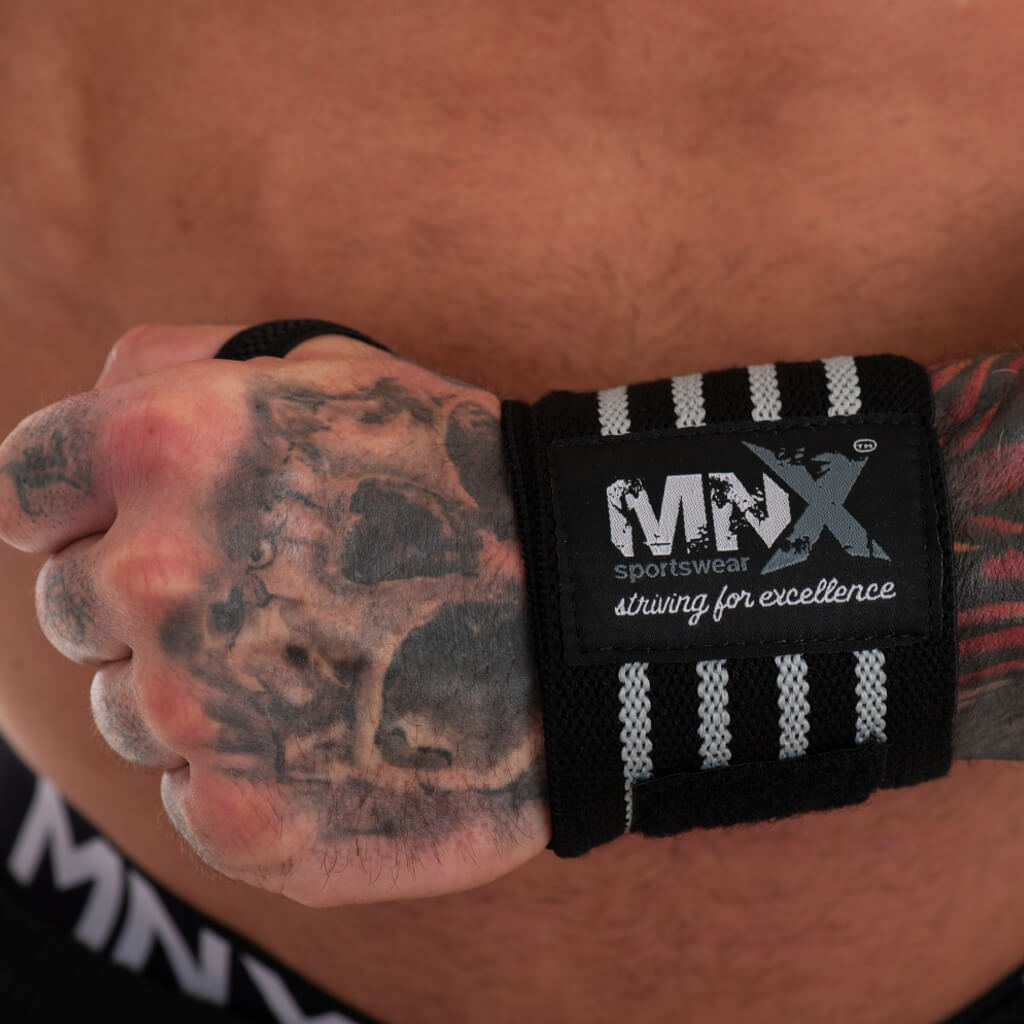 MNX wrist wraps for powerlifters and heavy pressers are constructed from the heaviest blend of cotton and elastane for superior support and long lasting. Wrist wraps provide much needed support and stability on your heaviest lifts. They will also protect your wrist against injuries.